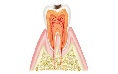 この時点で治療をすれば、神経を取らずにすみます。一刻も早く治療しましょう。歯の内部の少し深い所(象牙質)まで進んだ虫歯です。冷たいものがしみたりすることが多いです。虫歯の穴が大きい場合は詰め物で治すことが多いです。